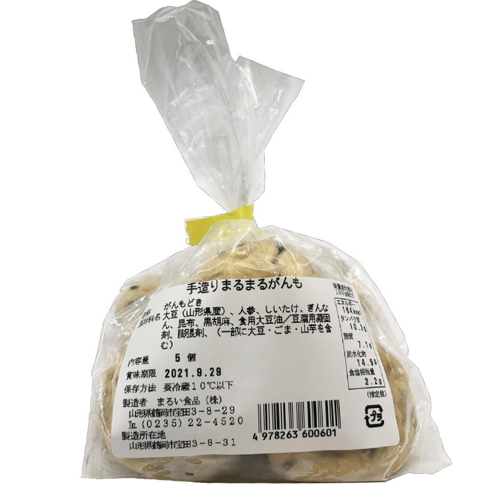 山形県産大豆100%のお豆腐を使って、人参、椎茸、昆布、銀杏、ごまを練り込み、手作業で丁寧に作った具だくさんのがんもどき。コトコト煮るとふんわりとやわらかくお召し上がりいただけます。